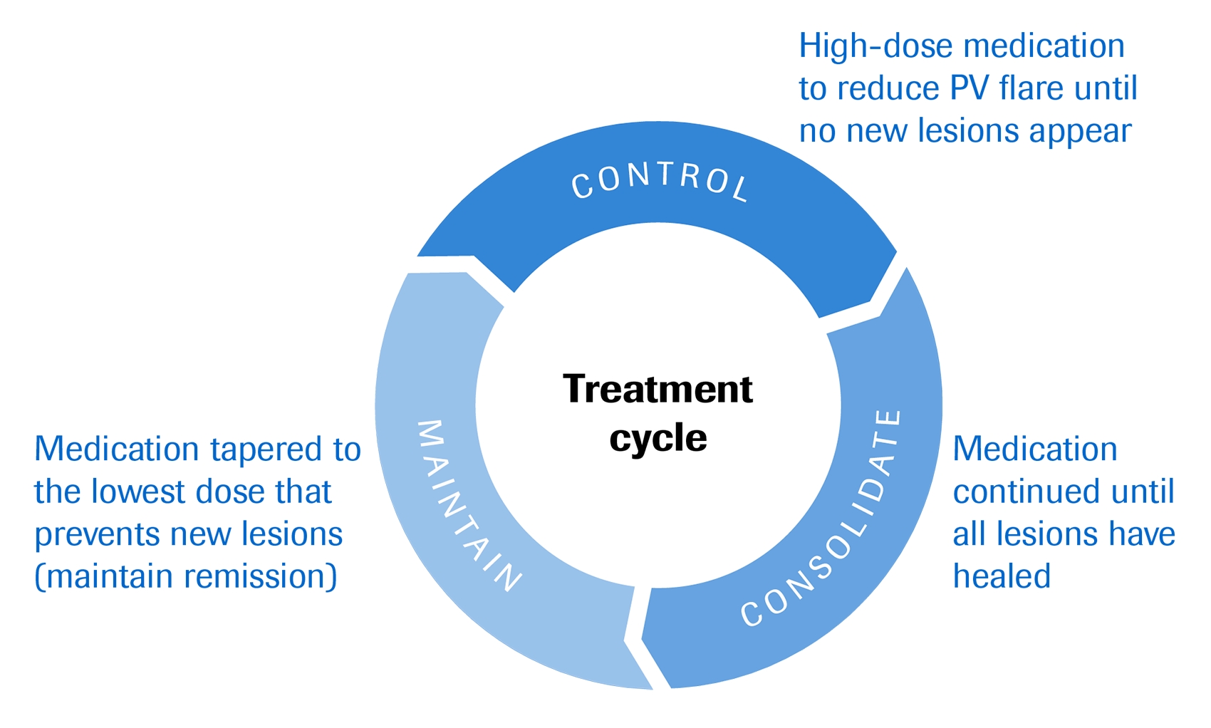 The purpose of PV treatment is to reduce the active disease (flare) with medication that dampens the body’s immune response. Once new lesions have stopped developing, treatment continues until lesions have healed. The aim is then to maintain PV remission whilst minimizing medication. In some cases PV may remain in remission without medication. In other cases, low doses of medication may be required to maintain remission. Due to its chronic relapsing course, PV may reoccur and the treatment cycle begins again.1